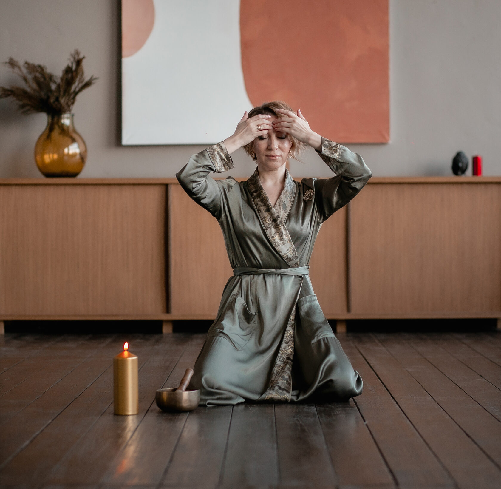 Ставим руки на точку между бровями в центре лба